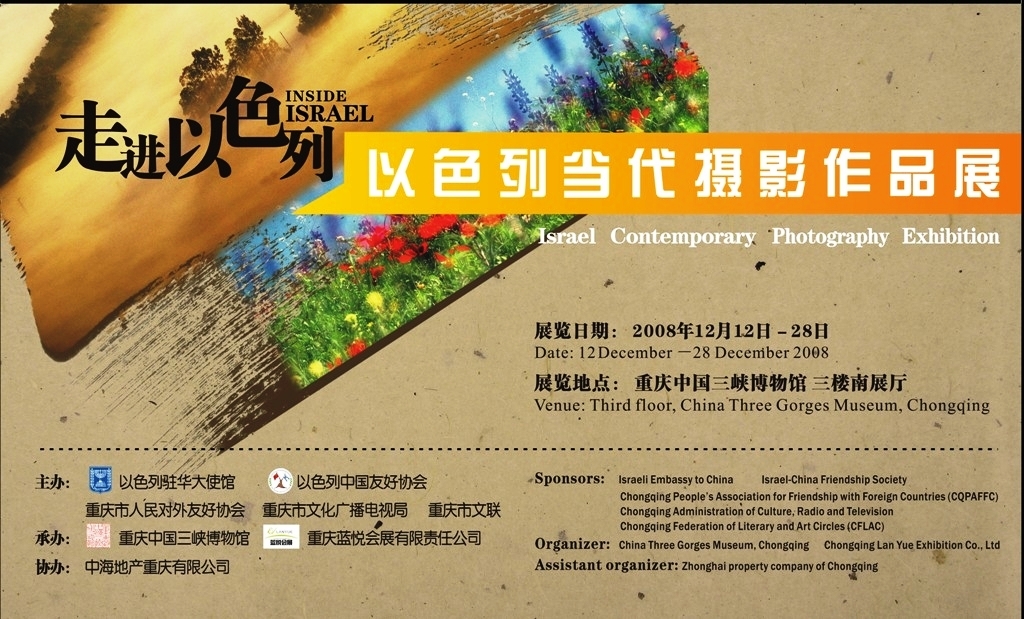 התערוכה, הכוללת כ-180 צילומים, תוצג לראשונה ב- 12 לדצמבר 2008, במוזיאון "שלושת הגדולים" בעיר צ'ונגצ'ינג בסין , בחלל תצוגה רחב היקף המונה למעלה מ 600 מ"ר שטח תצוגה. בפתיחת האירוע ישתתפו שגריר ישראל בסין וראש עירית צ'וגצ'נג .